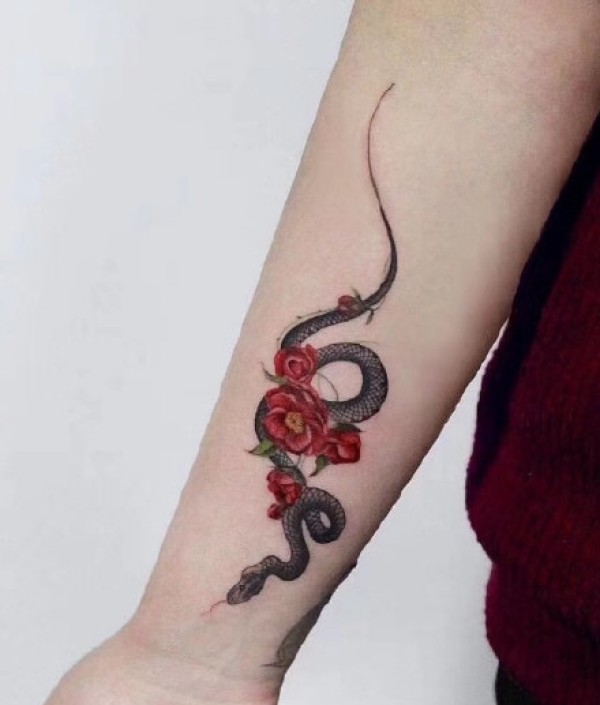 精美的小黑蛇与红色花朵的纹身图案作品图片