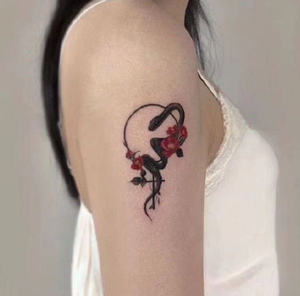 精美的小黑蛇与红色花朵的纹身图案作品图片
