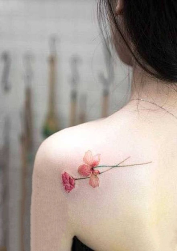 女生肩部锁骨的小清新水彩花朵纹身图案