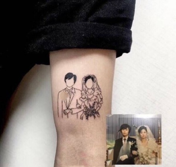 纹身照片 女生大臂上彩色的情侣结婚照纹身图片