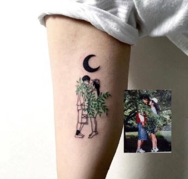 纹身照片 女生大臂上彩色的情侣结婚照纹身图片