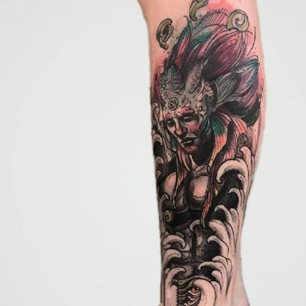 帅气的彩色花腿纹身水墨画纹身图案