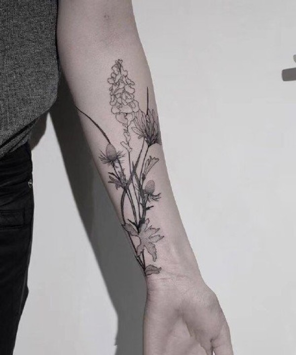 一组手臂上线条感极强的水墨植物花朵纹身图案