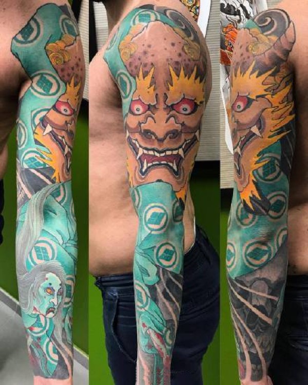 传统风格的一组男性花臂和花腿纹身图案欣赏