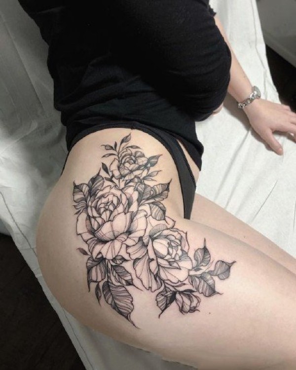 性感花朵纹身--女性大腿侧部性感的花朵纹身