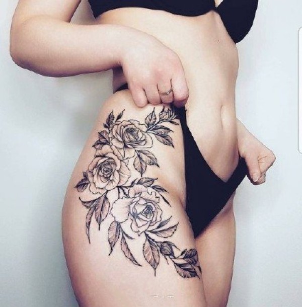 性感花朵纹身--女性大腿侧部性感的花朵纹身