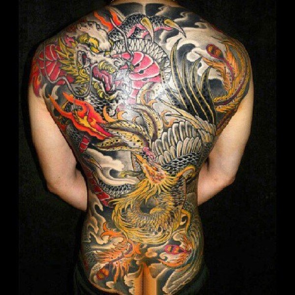 满背凤凰和鲤鱼纹身图案