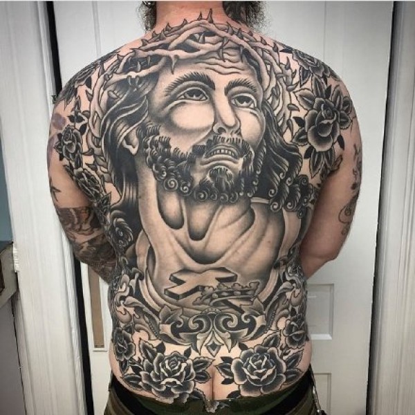 oldschool黑灰风格的9张男士大满背纹身图案作品