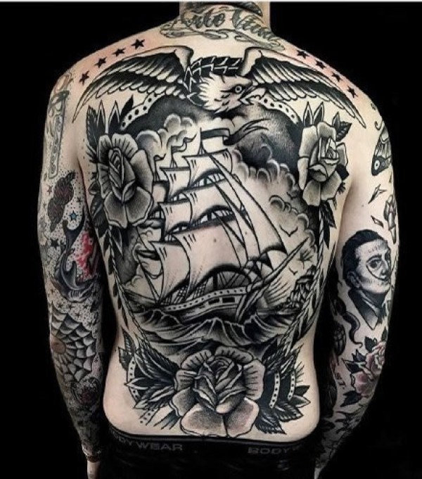 oldschool黑灰风格的9张男士大满背纹身图案作品