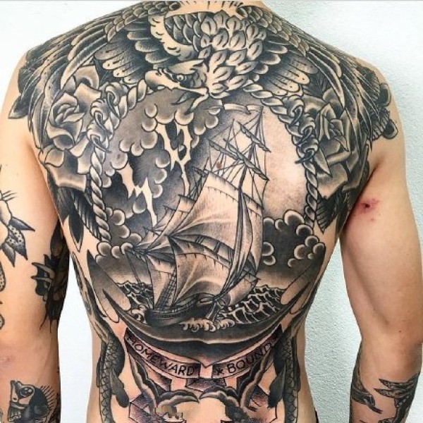 oldschool黑灰风格的9张男士大满背纹身图案作品