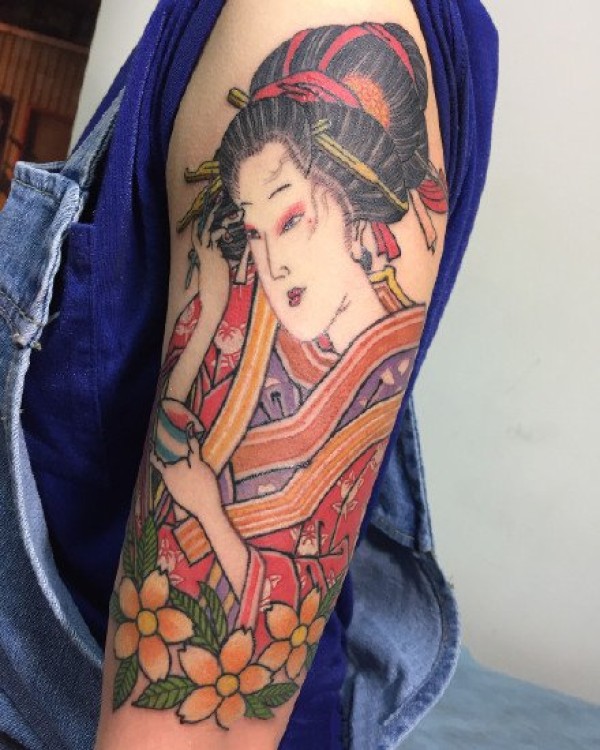 大臂上的日本艺妓纹身图案