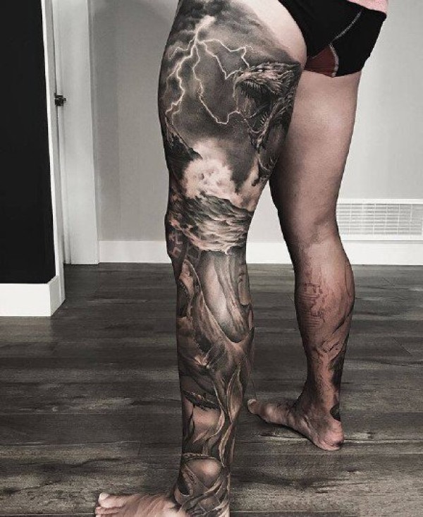 传统风格的霸气大花腿纹身作品欣赏