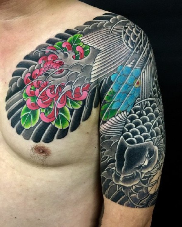 来自中国经典的传统半甲喜庆鲤鱼牡丹纹身手稿_半甲纹身图案大全_纹身图吧