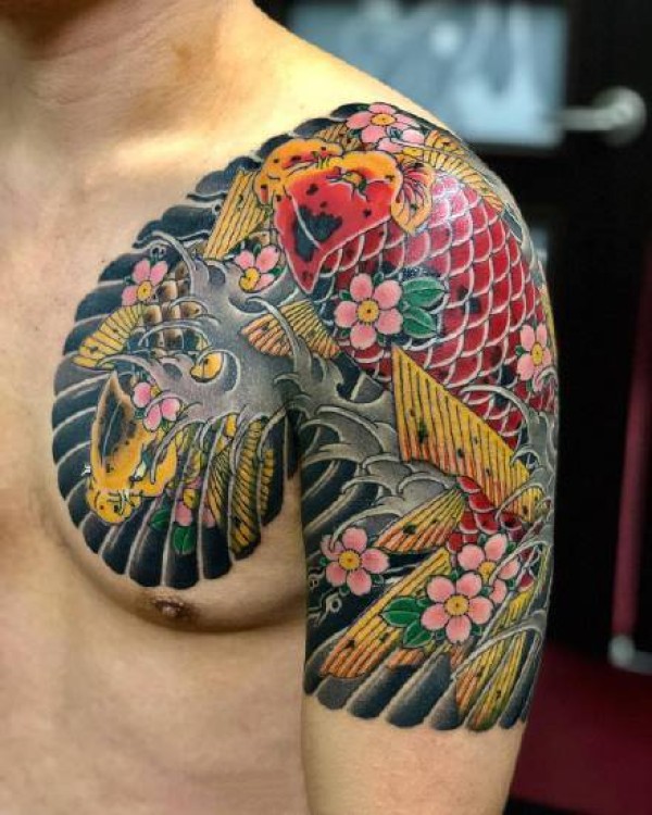 来自中国经典的传统半甲喜庆鲤鱼牡丹纹身手稿_半甲纹身图案大全_纹身图吧