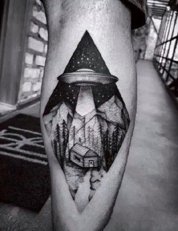 欧美小腿纹身 男生小腿上飞碟和建筑物纹身图片