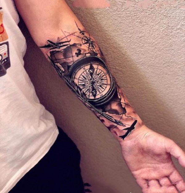 黑臂时钟纹身--一组男士小手臂上的黑臂时钟指南针纹身图案