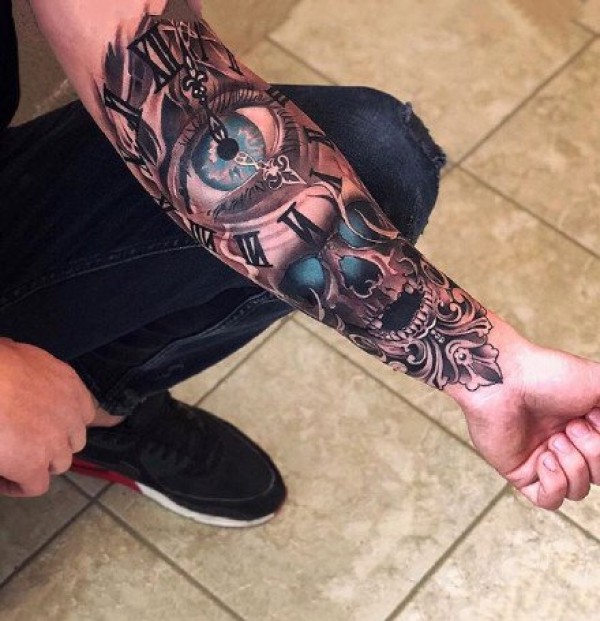 个性男孩手臂骷髅与时钟鸽子纹身图案