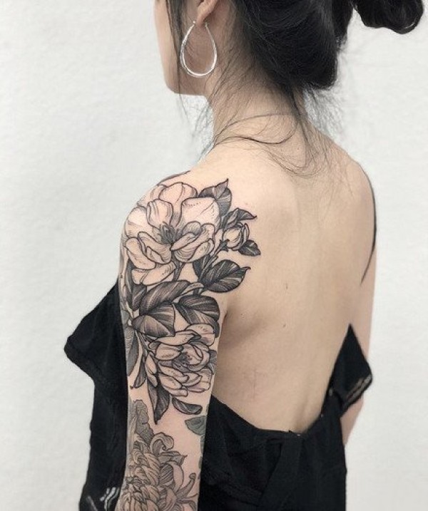 肩花纹身--一组适合肩部的黑灰肩花纹身图案欣赏