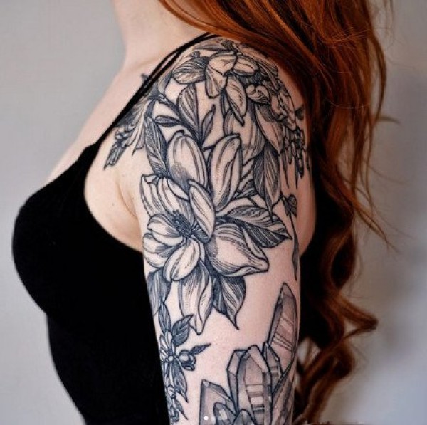 肩花纹身--一组适合肩部的黑灰肩花纹身图案欣赏