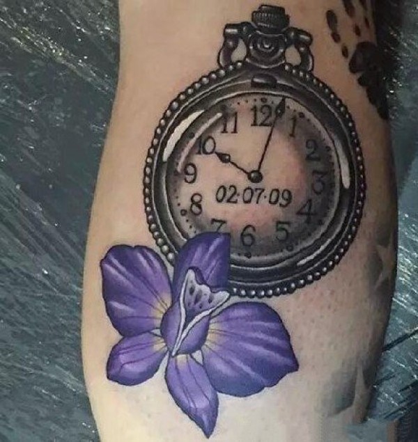 妹子腰部紫色的兰花纹身图案