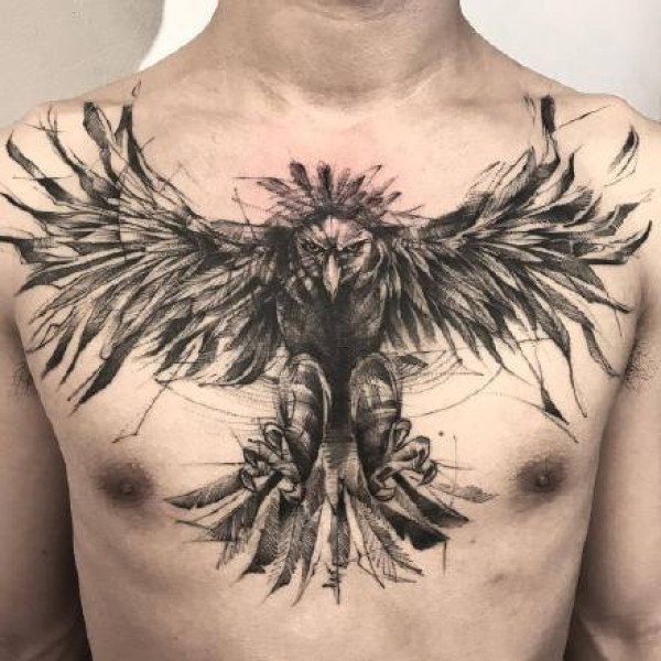 男生都喜欢的黑色素描点刺技巧霸气老鹰纹身图案