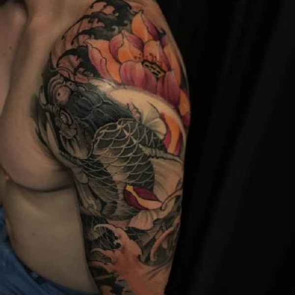 蝙蝠,幼狮,鲤鱼组成的花臂纹身