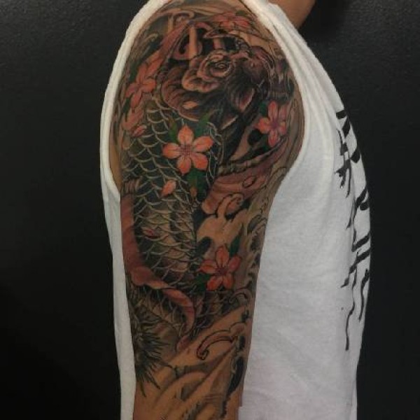 蝙蝠,幼狮,鲤鱼组成的花臂纹身