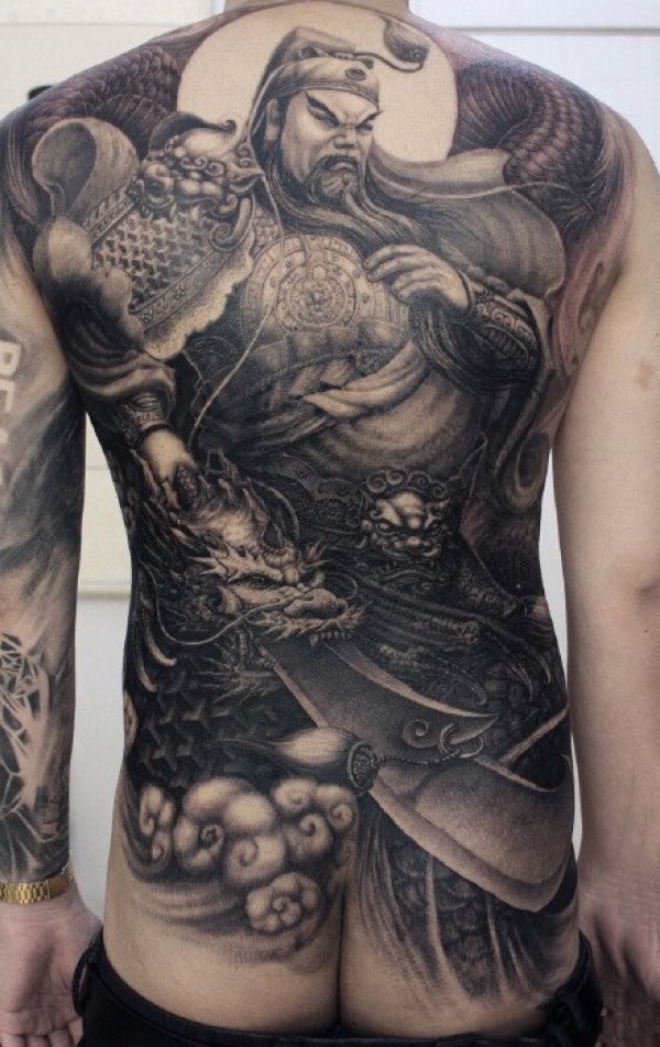新传统风格的9张男性黑灰大满背纹身图案图片