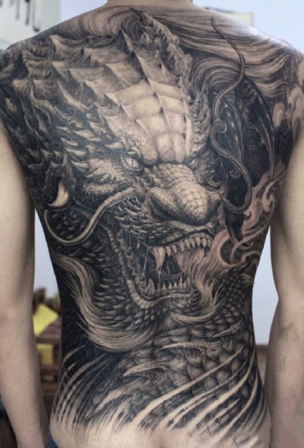 新传统风格的9张男性黑灰大满背纹身图案图片