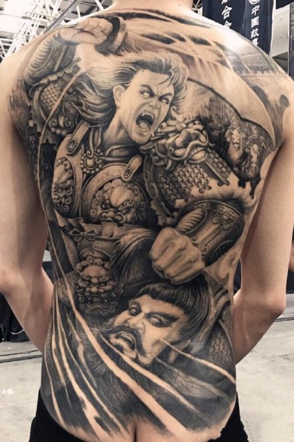 新传统风格的9张男性黑灰大满背纹身图案图片
