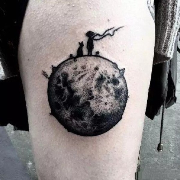 大腿上黑白灰风格点刺身抽象线条人物肖像纹身图片