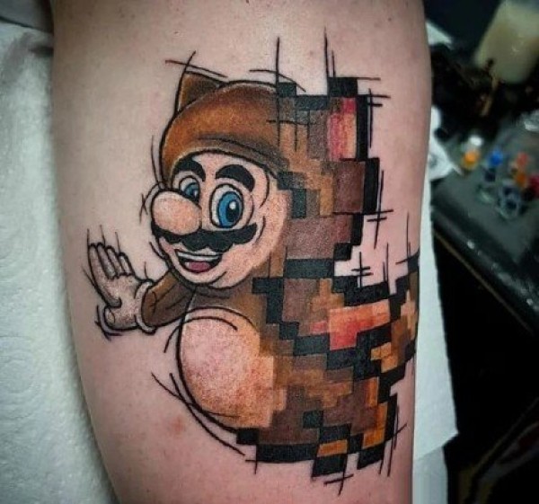 像素风格纹身 男生手臂上彩色的卡通人物纹身图片