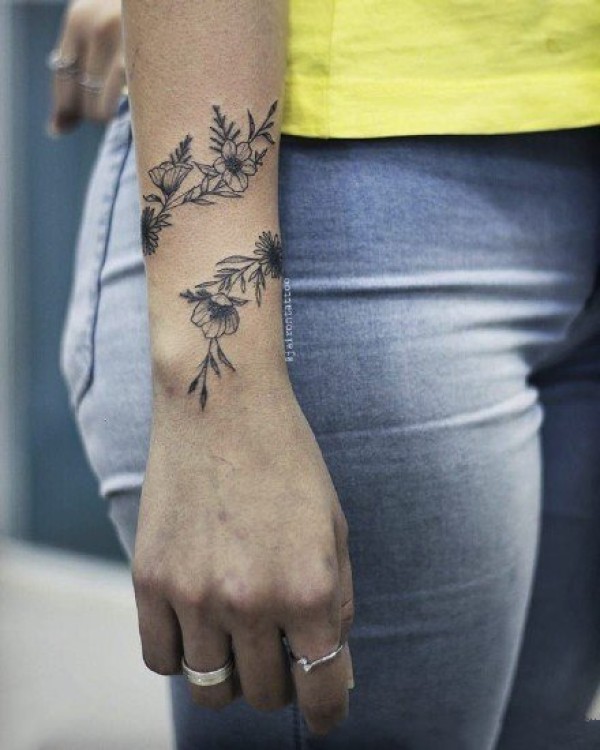 缠绕在小手臂手腕上的花藤纹身图案作品