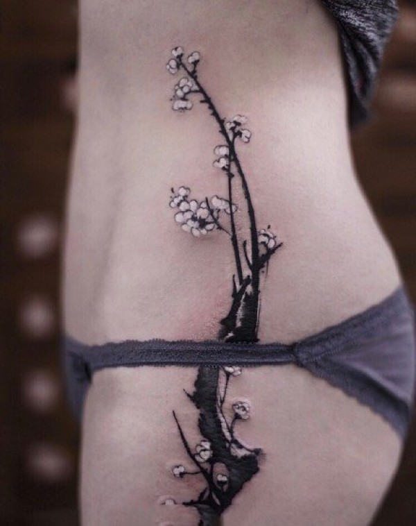 女性侧腰大腿处性感的中国风水墨纹身图案