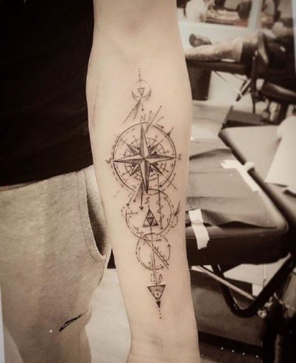 几何元素纹身 男生手臂上指南针和箭矢纹身图片
