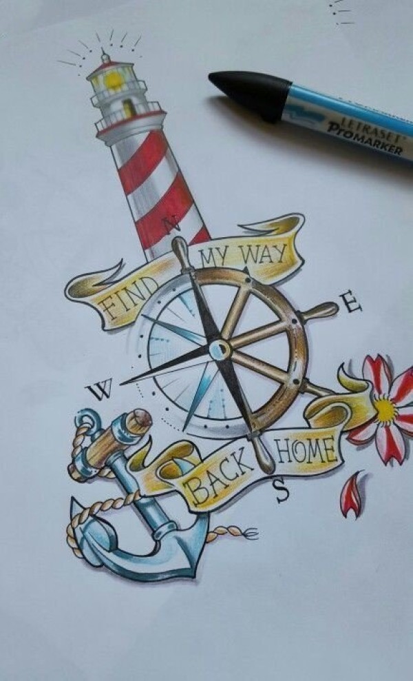 纹身图吧分享一张指南针文身手稿作品