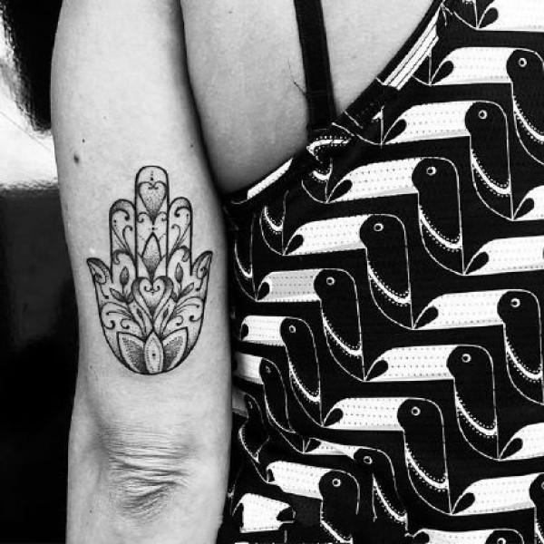 大臂后侧部的手肘拐处的一组小黑图纹身图案