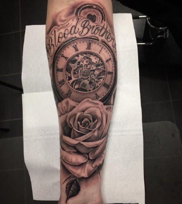 手臂胳膊上的欧美黑灰钟表玫瑰纹身图案9张