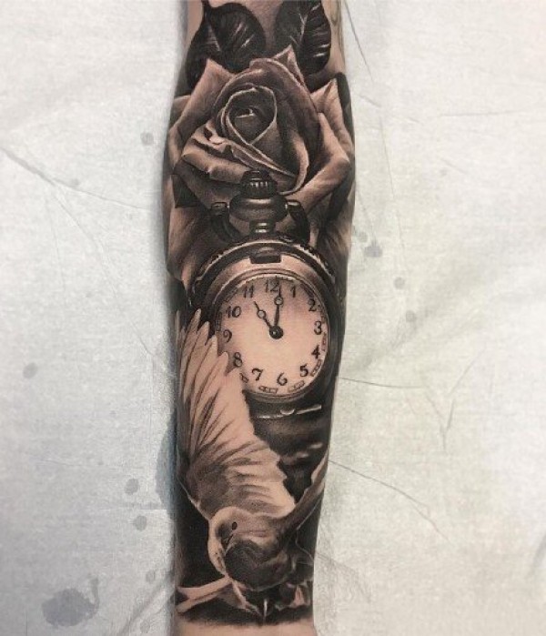 手臂胳膊上的欧美黑灰钟表玫瑰纹身图案9张