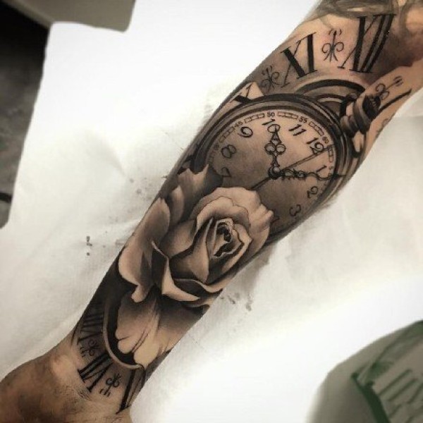 手臂胳膊上的欧美黑灰钟表玫瑰纹身图案9张