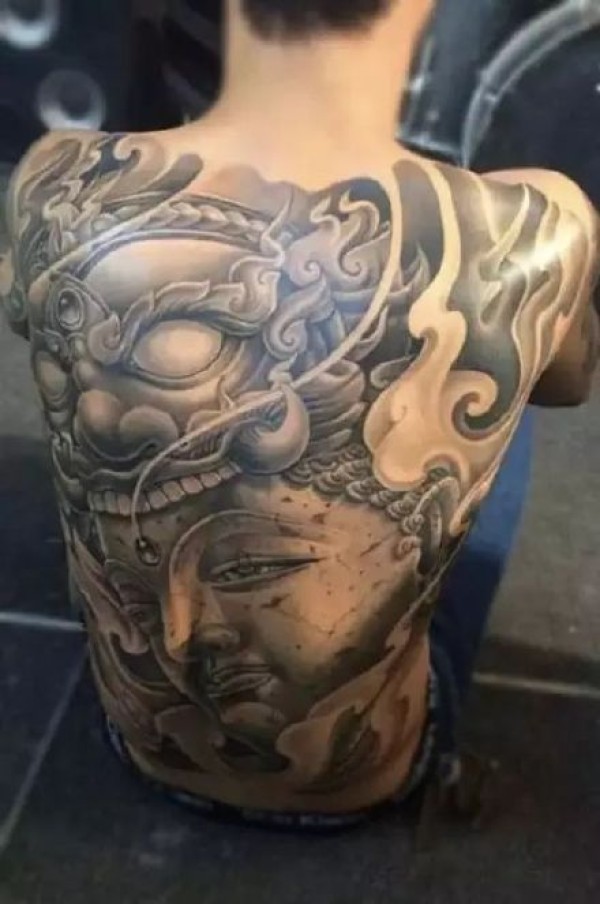 黑灰色大面积纹身龙头和斗战胜佛纹身图案