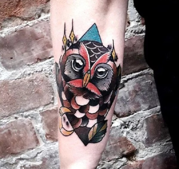 胳膊一张创意猫头鹰文身作品