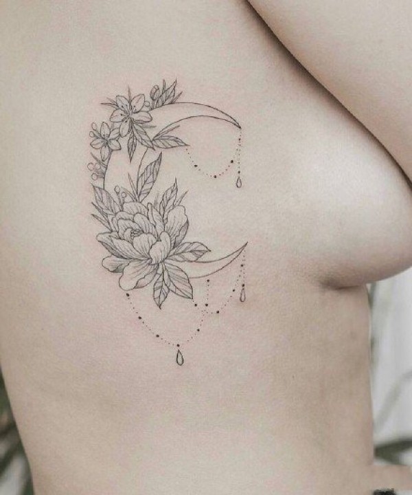 美女侧胸漂亮好看的花卉与字母纹身图图片