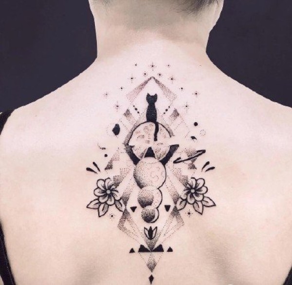 女生后腰纹身黑白灰风格抽象线条纹身图案