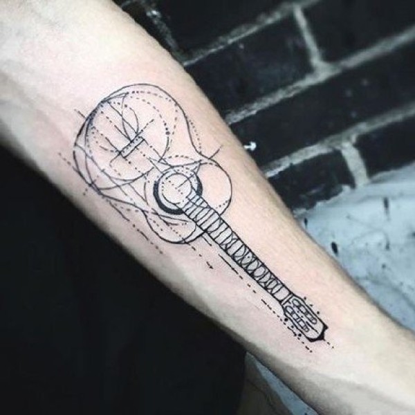男生手臂上黑色简单线条星空元素手弹吉他纹身图片