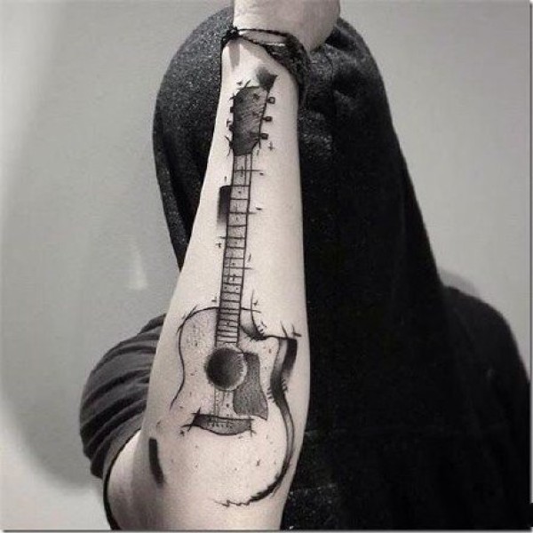 男生手臂上黑色简单线条星空元素手弹吉他纹身图片