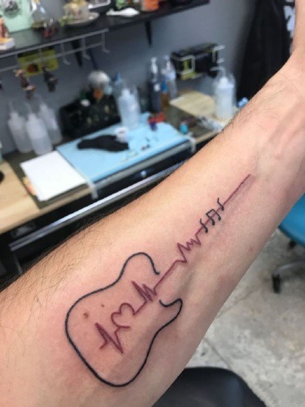 男生手臂上黑色简单线条星空元素手弹吉他纹身图片