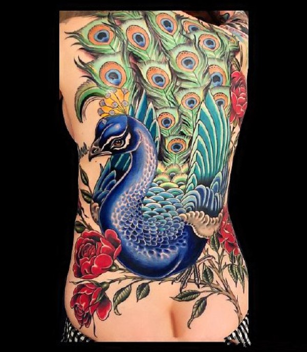 纹身图吧分享一张满背的彩色创意孔雀文身作品