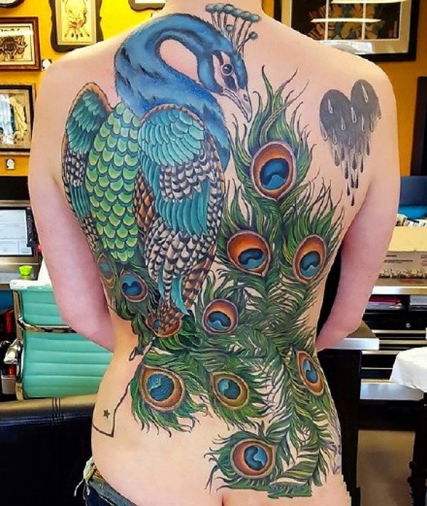 纹身图吧分享一张满背的彩色创意孔雀文身作品