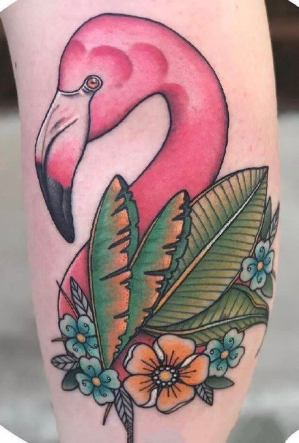 百乐动物纹身 女生小腿上彩色的火烈鸟纹身图片